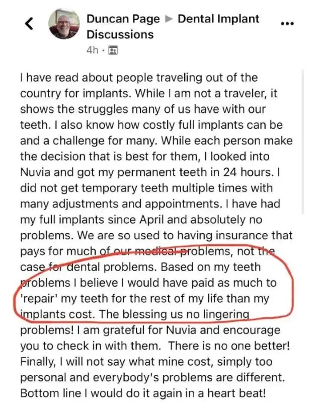 Nuvia Dental Implant Centers are locally owned and operated by licensed dental practitioners. These locally owned and operated practices are part of a professional network of dental implant centers operated by prosthodontists, oral surgeons, and restorative dentists. Each Nuvia Dental Implant Center has a business affiliation with Nuvia MSO, LLC, a Dental Support Organization that provides non-clinical support to each center. *Nuvia Dental Implant Centers are able to provide patients with a bridge made with an FDA approved permanent material, zirconia, in 24-hours. No temporary denture. Not all those who come in for a consultation are medically cleared to receive permanent zirconia teeth in 24-hours. Follow up appointments are required to confirm implant integration and make adjustments if necessary. Results may vary in individual cases. Patients represented in videos are actual NUVIA patient(s) and may have been compensated for their time in telling their story.