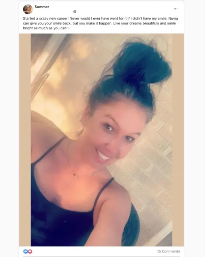 And look at a facebook post one of our patients made about a new career she just started! She received a new set of permanent teeth in 24 hours from us here at Nuvia over a year ago. She needed her full upper and lower set of teeth replaced.